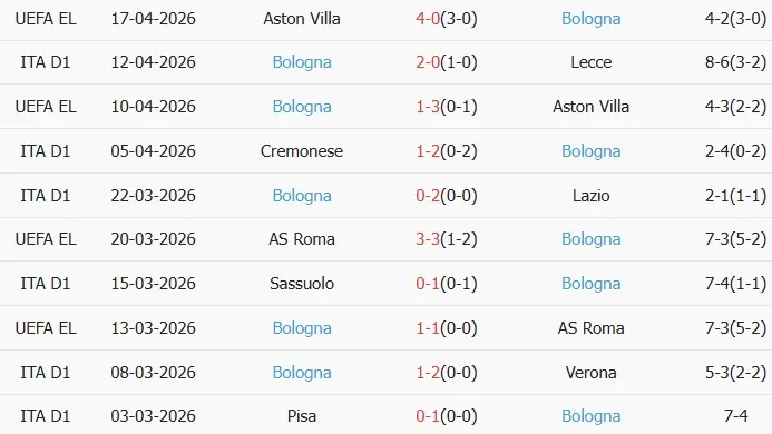 Thống kê phong độ 10 trận đấu gần nhất của Bologna