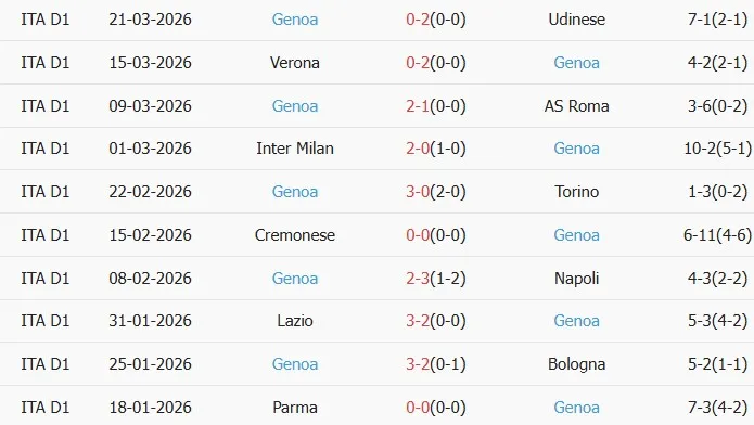 Thống kê phong độ 10 trận đấu gần nhất của Genoa cho thấy sự khó khăn và thách thức mà họ phải đối mặt.
