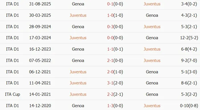 Lịch sử đối đầu giữa Juventus và Genoa cho thấy sự chênh lệch về sức mạnh và phong độ giữa hai đội.