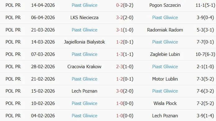 Thống kê phong độ 10 trận đấu gần nhất của Piast Gliwice