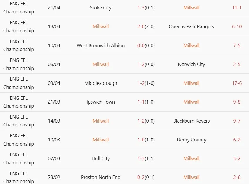 Thống kê phong độ 10 trận đấu gần nhất của Millwall