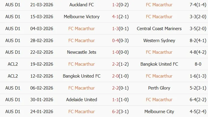 Thống kê phong độ 10 trận đấu gần nhất của Macarthur