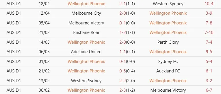 Thống kê phong độ 10 trận đấu gần nhất của Wellington Phoenix