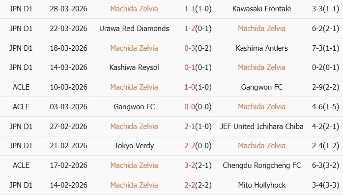 Thống kê phong độ 10 trận đấu gần nhất của Machida Zelvia