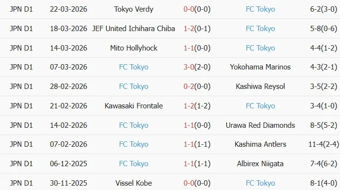 Thống kê phong độ 10 trận đấu gần nhất của Tokyo