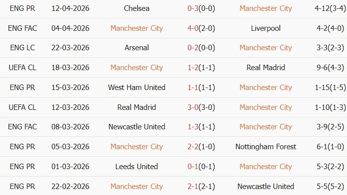 Thống kê phong độ 10 trận đấu gần nhất Man City