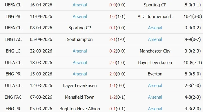 Thống kê phong độ 10 trận đấu gần nhất của Arsenal