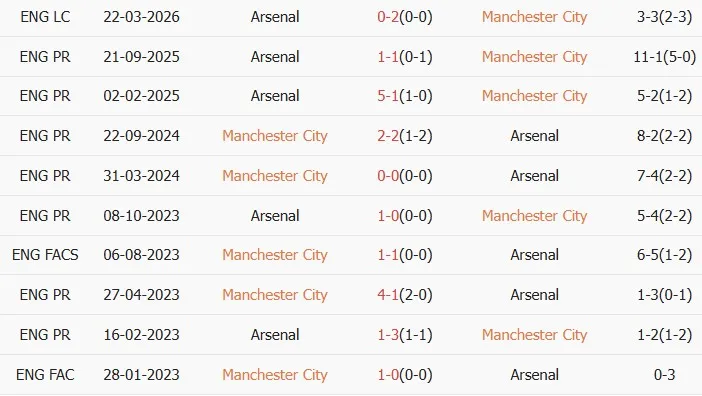Thống kê phong độ, lịch sử đối đầu của Man City vs Arsenal