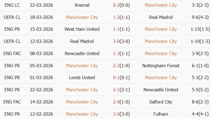 Thống kê phong độ 10 trận đấu gần nhất của Man City