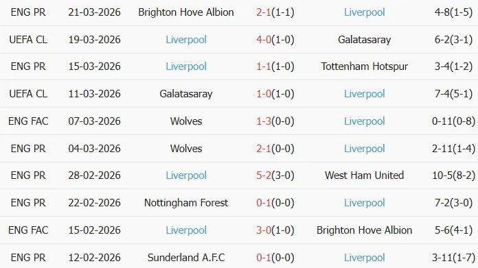 Thống kê phong độ 10 trận đấu gần nhất của Liverpool