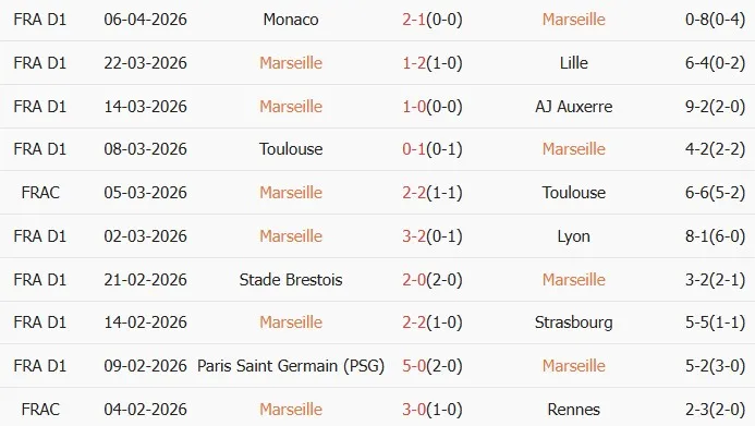 Thống kê phong độ 10 trận đấu gần nhất của Marseille
