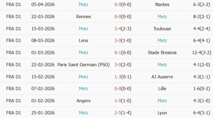 Thống kê phong độ 10 trận đấu gần nhất của Metz