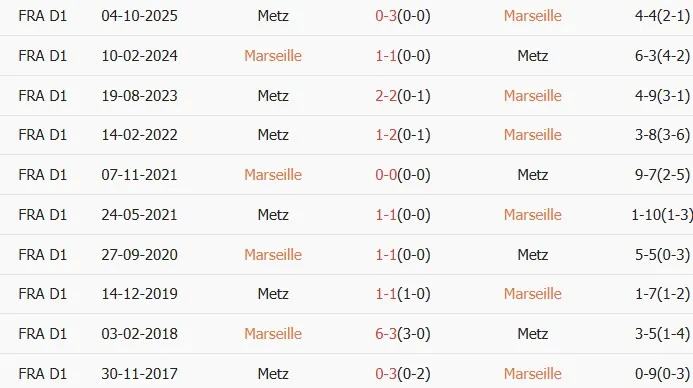 Lịch sử đối đầu Marseille vs Metz