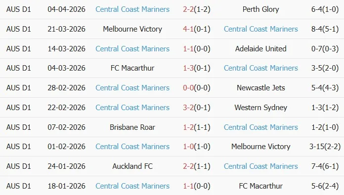 Thống kê phong độ 10 trận đấu gần nhất của Central Coast Mariners