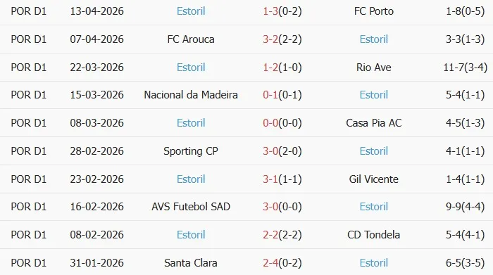 Thống kê phong độ 10 trận đấu gần nhất của Estoril Praia