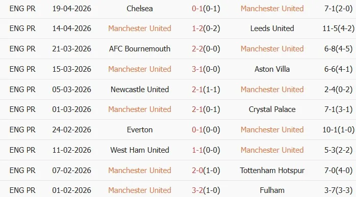 Thống kê phong độ 10 trận đấu gần nhất của MU