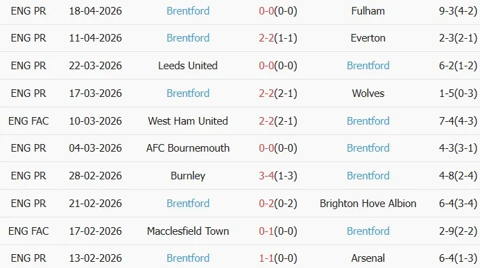 Thống kê phong độ 10 trận đấu gần nhất của Brentford