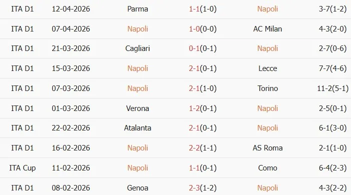 Thống kê phong độ 10 trận đấu gần nhất Napoli