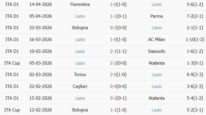 Thống kê phong độ 10 trận đấu gần nhất của Lazio