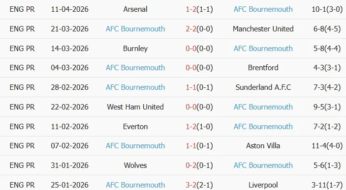 Thống kê phong độ 10 trận đấu gần nhất của Bournemouth