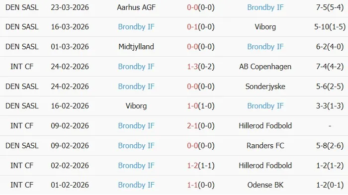 Thống kê phong độ 10 trận đấu gần nhất của Brondby