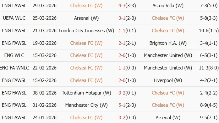 Thống kê phong độ 10 trận đấu gần nhất của Nữ Chelsea