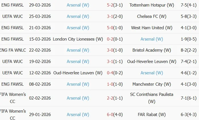 Thống kê phong độ 10 trận đấu gần nhất của Nữ Arsenal