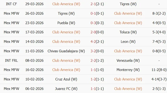 Thống kê phong độ 10 trận đấu gần nhất của Nữ Club America