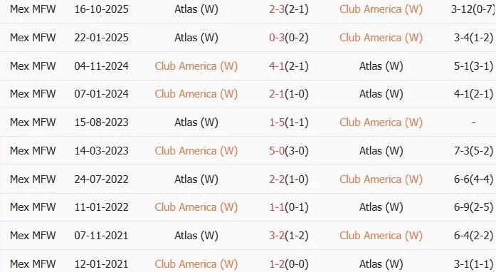 Lịch sử đối đầu Nữ Club America vs Nữ Atlas