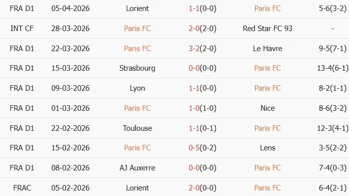 Thống kê phong độ 10 trận đấu gần nhất của Paris