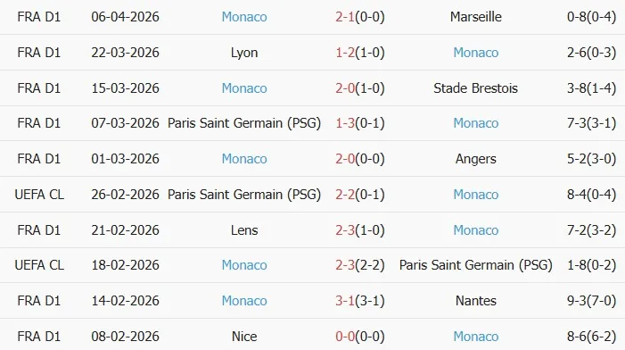 Thống kê phong độ 10 trận đấu gần nhất của AS Monaco