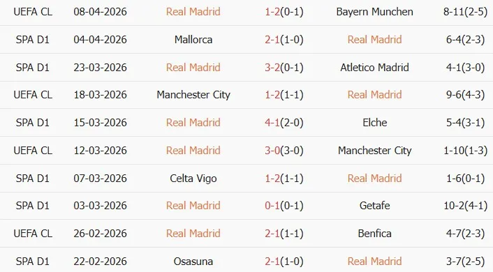 Thống kê phong độ 10 trận đấu gần nhất của Real Madrid
