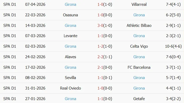 Thống kê phong độ 10 trận đấu gần nhất của Girona