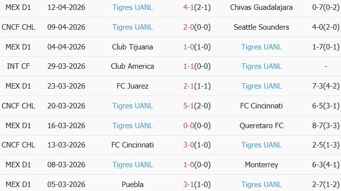 Thống kê phong độ 10 trận đấu gần nhất của Tigres UANL