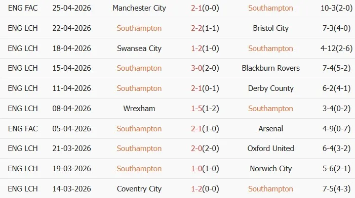 Thống kê phong độ 10 trận đấu gần nhất của Southampton