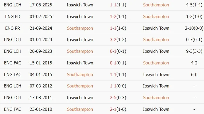Thống kê phong độ, lịch sử đối đầu của Southampton vs Ipswich Town
