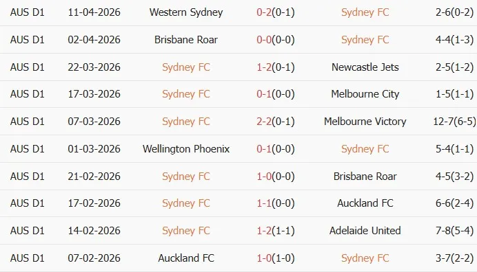 Thống kê phong độ 10 trận đấu gần nhất của Sydney