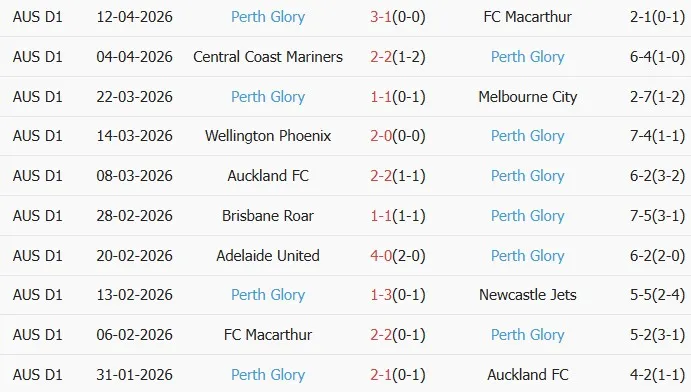 Thống kê phong độ 10 trận đấu gần nhất của Perth Glory