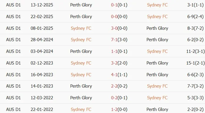 Thống kê cho thấy, trong 5 trận gần nhất, Sydney tạo được 13 tình huống cố định tại điểm cột cờ trước giờ nghỉ. Tính trung bình mỗi 45 phút có 2.6 trái. Ở chiều ngược lại, Perth Glory lại cho thấy sự yếu kém trong khâu phòng ngự biên. Họ thường xuyên bị đối thủ khai thác khoảng trống phía sau hai hậu vệ cánh, đặc biệt khi đội hình dâng lên không đồng bộ.