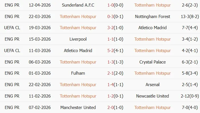 Thống kê phong độ 10 trận đấu gần nhất Tottenham
