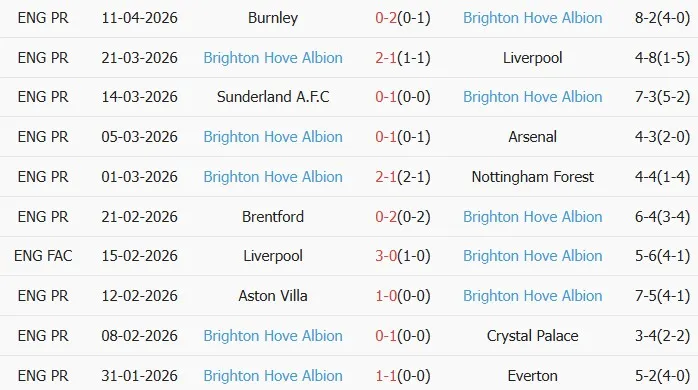 Thống kê phong độ 10 trận đấu gần nhất của Brighton