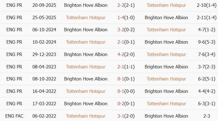 Lịch sử đối đầu Tottenham vs Brighton