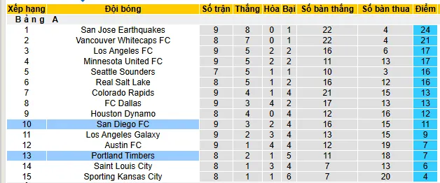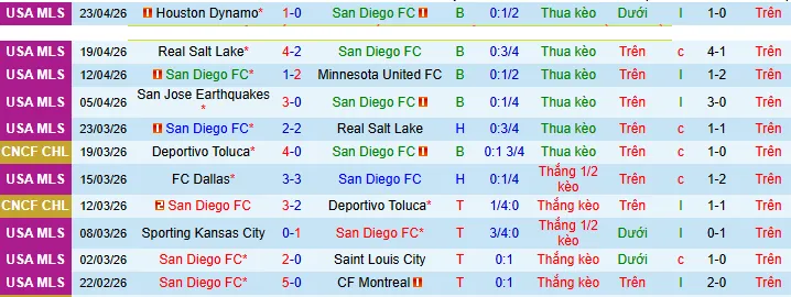 + San Diego thắng 3 thua 5 hòa 2 trong 10 trận gần đây ở giải MLS.