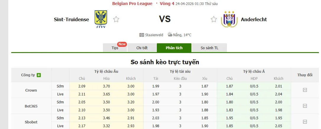 Sint-Truidense đã thua kèo tới 7 trong số 9 trận đấu gần đây khi đối đầu với Anderlecht tại mọi đấu trường. Đồng thời, họ cũng vừa trải qua mạch 5 trận không thắng kèo tại giải VĐQG Bỉ. Ngược lại, Anderlecht lại thắng kèo tới 5 trong số 8 trận đấu vừa qua, trở thành lựa chọn an toàn cho người hâm mộ.