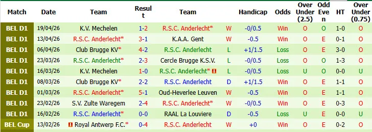 Thống kê phong độ 10 trận đấu gần nhất của Anderlecht