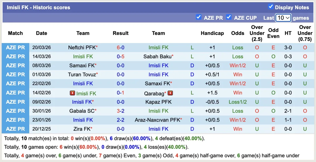 -Thống kê phong độ 10 trận đấu gần nhất của Imisli