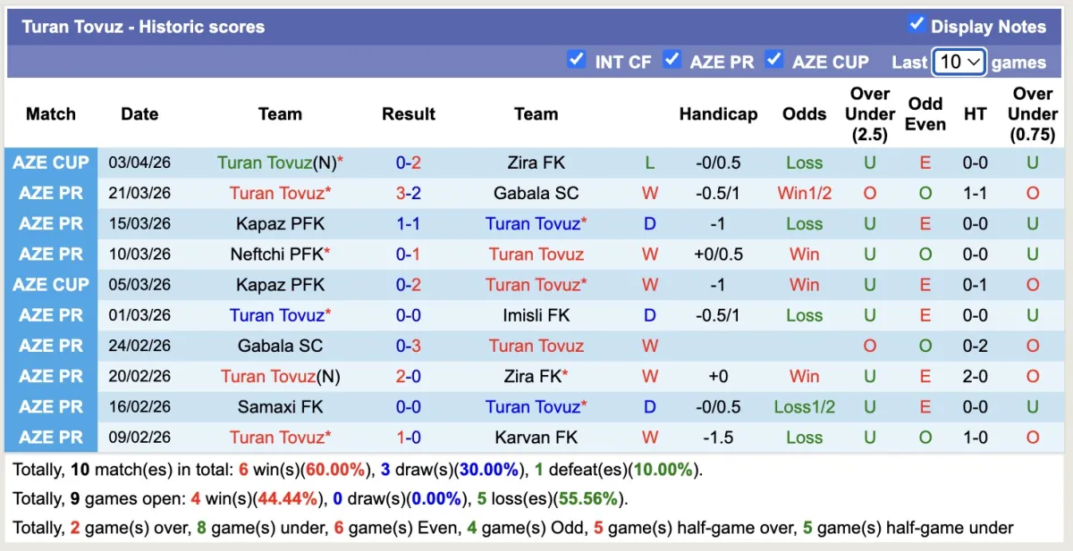 -Thống kê phong độ 10 trận đấu gần nhất của Turan Tovuz