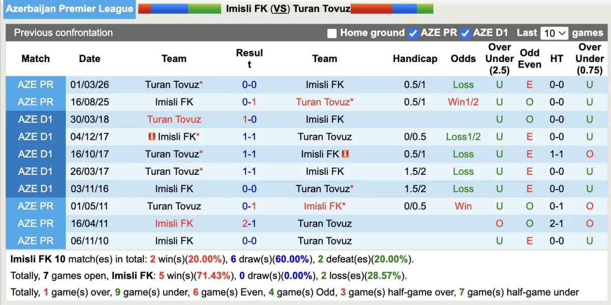 Lịch sử đang chỉ ra rằng 8 lần đối đầu gần nhất giữa hai câu lạc bộ kèo Tài không nổ. Mặt khác hàng công của Imisli và Turan Tovuz không sắc bén khi 25 vòng đấu đã qua đội chủ nhà chỉ sở hữu 18 bàn, con số này của đội khách là 32. Khả năng trận đấu dừng lại ở mức bàn thắng thấp.