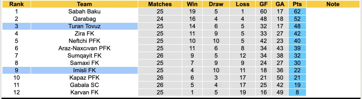 Sau 25 vòng đấu đã qua tại giải VĐQG Azerbaijan, Imisli chỉ đang sở hữu 4 chiến thắng, hoà 10 và nếm đến 11 thất bại. Với 22 điểm có được đội chủ nhà hiện đang đứng thứ 9 trên bảng xếp hạng và hơn nhóm đèn đỏ 3 điểm.