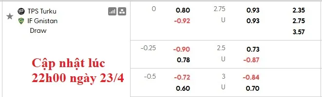 Turun Palloseura thắng kèo cả 3 trận vừa qua tại giải VĐQG Phần Lan, là đội duy nhất có tỷ lệ thắng kèo 100%. Ngược lại, Gnistan chỉ thắng kèo có 1 trận. Dù kèo châu Á chỉ là 0:0, nhưng đội chủ nhà vẫn đáng tin cậy.